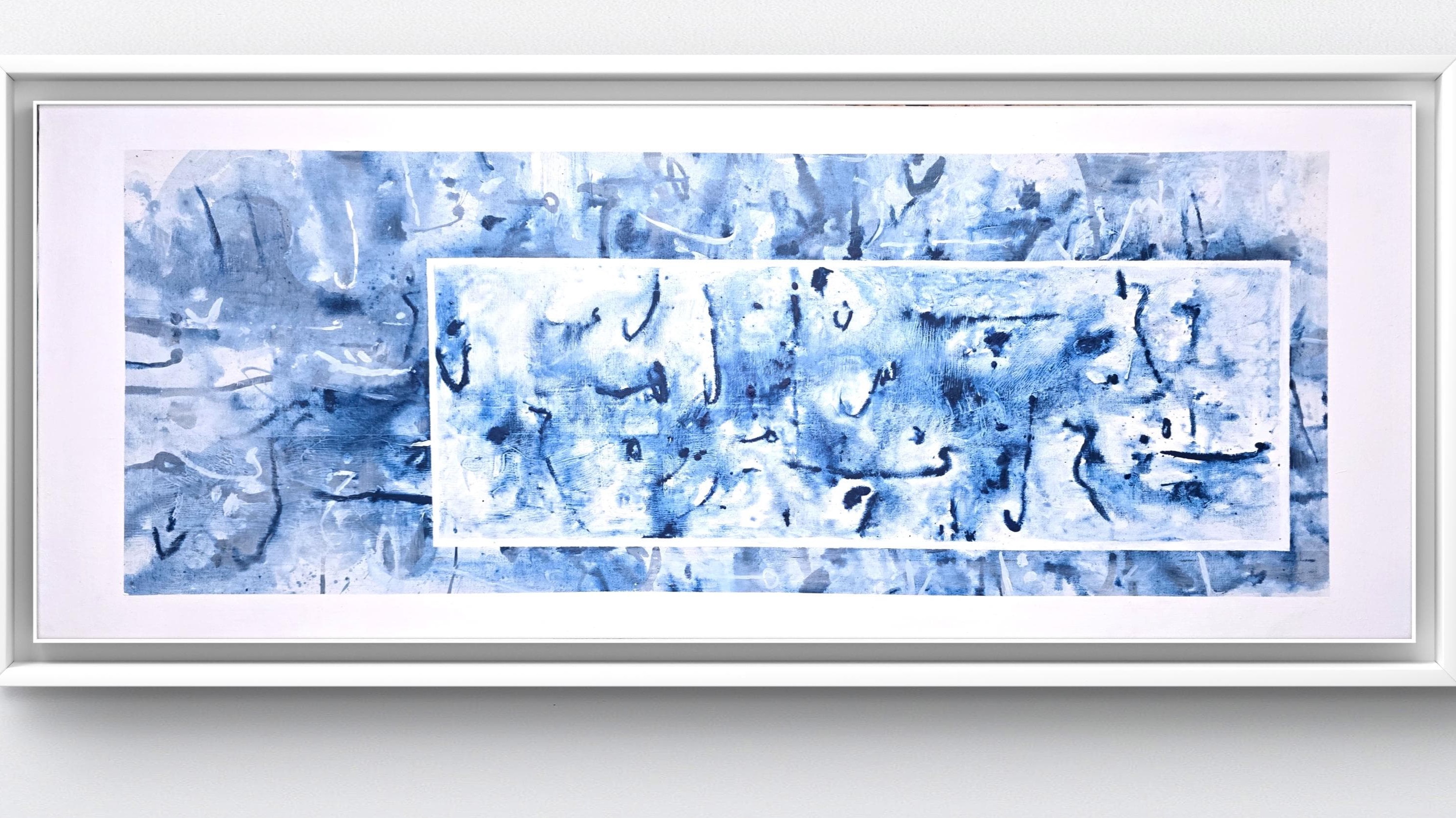 Lukisan karya Umar Farq ini adalah eksplorasi visual terhadap aksara Arab yang terpotong-potong, menjadi fragmen-fragmen huruf yang mengapung di atas lapisan biru, seperti ingatan yang samar namun mendalam.