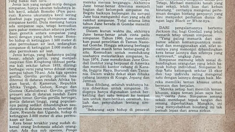 Jane Goodall telah berpulang. Selain dikenal sebagai ilmuwan primatologi, kepribadiannya yang penuh rendah hati, sopan kepada siapa pun, telah membekas bagi setiap wajah yang dijumpainya.