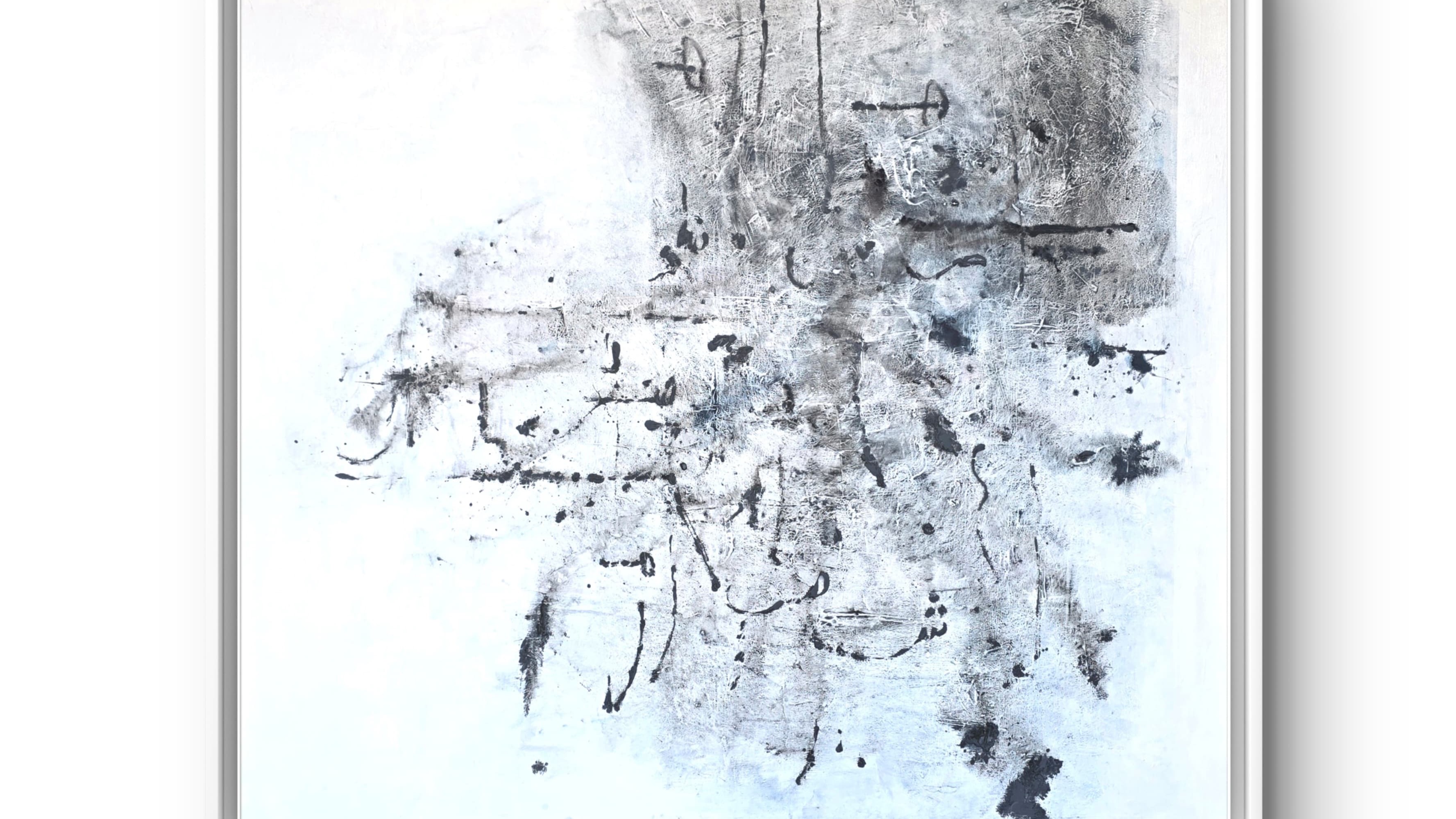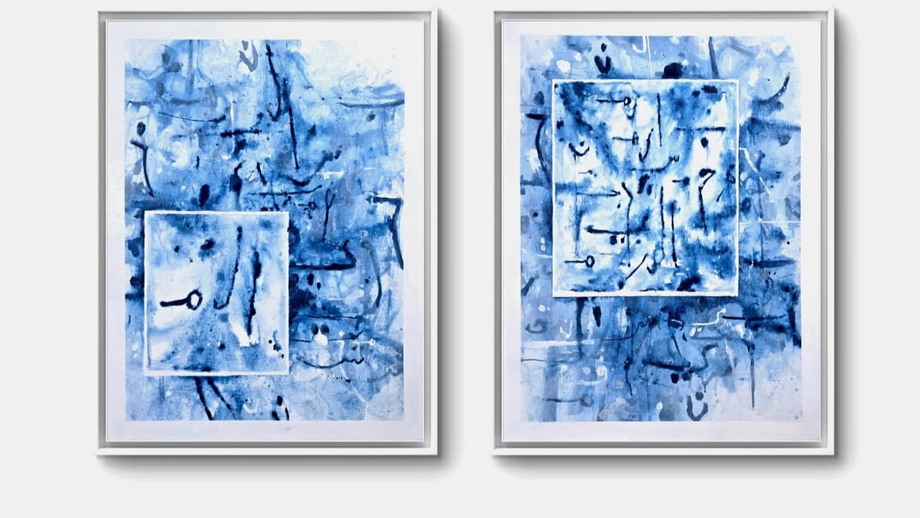 Lukisan karya Umar Farq ini adalah eksplorasi visual terhadap aksara Arab yang terpotong-potong, menjadi fragmen-fragmen huruf yang mengapung di atas lapisan biru, seperti ingatan yang samar namun mendalam.